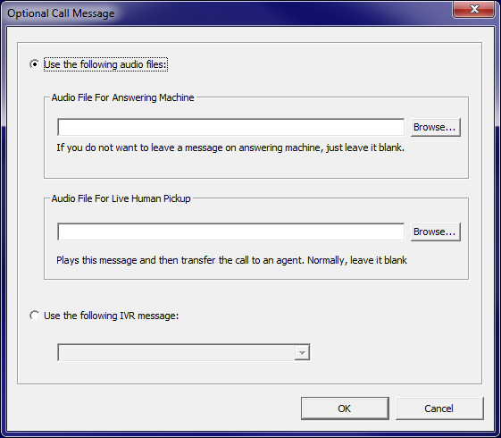 Here you can load audio files for when the software encounters an answering machine or you can load an audio file that can play before transferring a human pick-up to an Agent. Additionally, you can use an IVR application that is deployed to the connected Gateway.