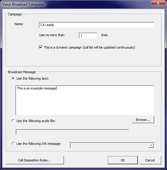You will also want to fill in one of the message fields if you want to broadcast a message. Check and fill in the corresponding field if you wish to use text-to-speech as your message. Check and select to select a previously recorded audio file. If you have designed an outbound IVR application (and deployed it to the connected Gateway), then check and select the IVR application you have deployed.
