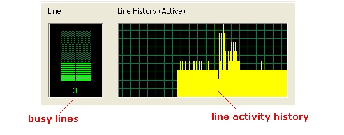 While Voicent Call Center Manager is running it will display performance information automatically. The three panels in the performance window shows drop rate, campaign, agent, and line activities. The performance meter on the left shows the current readings. The history data is shown on the right.