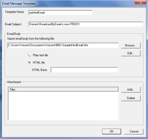 The window will appear. Give your template a descriptive name, such as . Specify the email subject line and click the button to select the email message file you created in step one. You may need to change the filter on the bottom right of the dialogue to see html files.