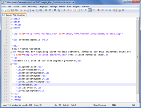 Use your favorite HTML editor to write your email message body and save it in a file such as . Pictured below is one such program, Notepad++, a popular and free syntax highlighting text editor.