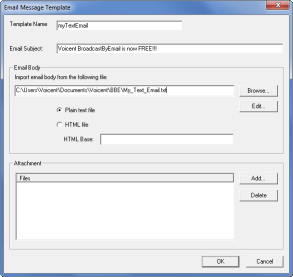 If you click , the dialogue should appear. Give any name to your template, such as . Specify the email subject line. Then click the button to select your email message file you created in step one. Click .