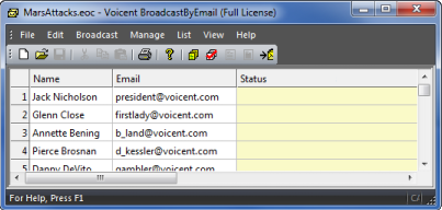 Open BroadcastByEmail, in the Email column, type in recipients' email addresses. Each row should only contain one email address. The Name column is not required.