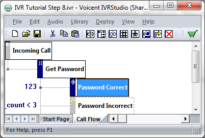 The link between elements is called a transition. A transition defines a change of the active element. In order for a transition to happen, the condition for the transition must be satisfied. For example, the transition from Get Password to Password Correct happens only when the caller enters the correct password 123.
