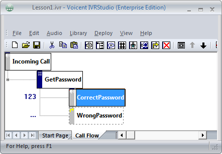 -The condition of the first transition is satisfied, the active element now is Correct Password. The prompt of the element is played. - IVR: disconnect call.