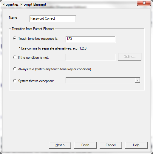 The transition from the Parent Element box defines the conditions for when the element is to be activated. In this example, if 123# is entered and collected by the parent element Get Password, then the next element is activated.