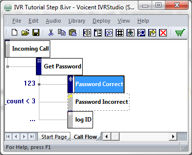 If the number of password attempts is greater than three, the system logs the caller ID and disconnects the call. To accomplish this, we'll add an element to handle this situation.