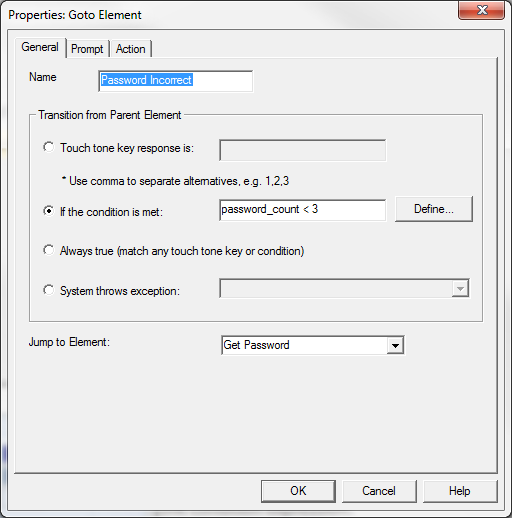 The transition condition is defined within the element being transitioned to. In this example, the condition is defined in the Password Incorrect element. To change the condition, right click on the element, then select .