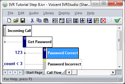 The updated call flow diagram is shown below. As we can see, if the password entered is 123, the system activates the Password Correct element. If the number of password attempts is less than 3, the Password Incorrect element is activated.