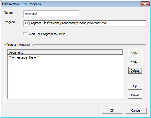 When this action is executed, it will run the batch file C:\Call List\runvcast.bat with the actual value of message_file as the first argument.