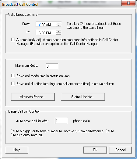 This setting allows you to control which hours automatic calls will be made by the auto dialer. Simply choose which hours you want broadcasting to start and end. If you want to allow it to run during any time of day just set the two time settings ( and ) to the exact same time.