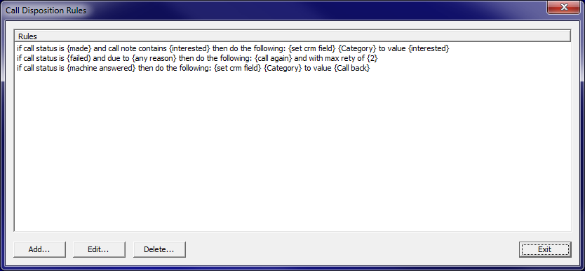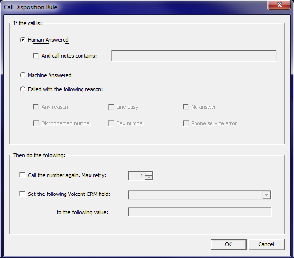 The top half of this window deals with the initial status of the call and bottom half describes the action taken when a call meets the chosen requirement. In addition to the examples listed above, you can customize what to find in the call notes to trigger a certain disposition, retry calling the number again depending the reason for why the call failed, and more. If you want to have a variety of CRM fields to use in the menu, simply create some categories in your CRM before starting the campaign. See this page for more information on creating custom fields: Setup Custom Fields