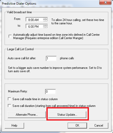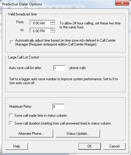 In a large call list you may not think of saving your call list file after you set it to run. This setting will determine the number of phone calls that needs to be made before it auto saves to another file within the same directory. For example, if your file is , it will create another file called . If you want to turn off auto save, just set the value to 0.