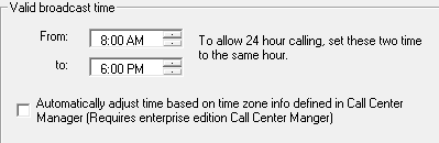 This setting allows you to control which hours automatic calls will be made by the predictive dialer. Simply choose which hours you want predictive dialing to start and end. If you want to allow it to run during any time of day just set the two time settings ( and ) to the exact same time.