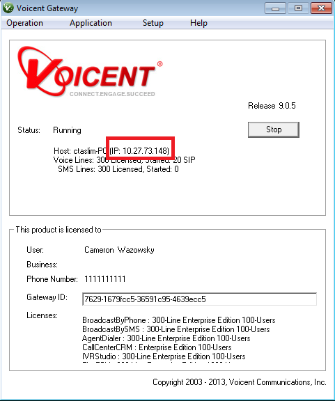 - In the field, enter in the IP address where Voicent Gateway is. You will be able to find the IP address Gateway is connected to by opening the Voicent Gateway window.