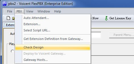 Once you have finished your PBX design, you need to check it first before deploying it to the Voicent Gateway program in order to activate the system. To check your PBX design, go to -> Make sure you have saved your current design before attempting to check it. The menu item will be disabled before the design check is completed with no errors found in the design.