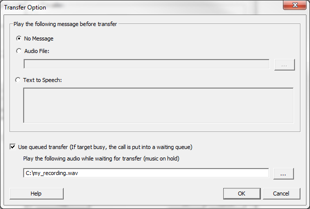 To play messages before a call transfer, type in the location of an audio file or click on the button to browse for an audio file. Alternatively, you can type in a message in the box to play a prompt vocalized by an automated voice. For example, the message defined in music on hold for queued transfer might not be played at all as mentioned in the previous section. To make sure something is always played, specify an audio file or text in the voice in the box shown above.