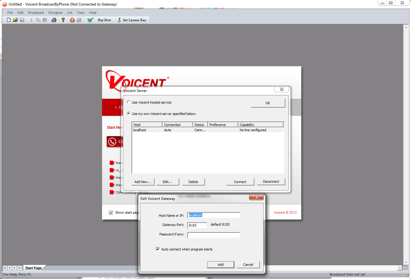 Open , from the program's main menu select then . The default entry will be "localhost" which means your BroadcastByPhone will attempt to connect to the same computer's Voicent Gateway. You can delete this entry and add a new entry to remotely connect to a network LAN or WAN computer. Firewall port 8155 will need to be opened in order to facilitate this connection.