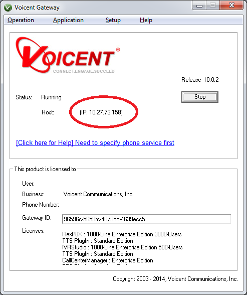 Double click the Voicent Gateway icon to open the Voicent Gateway. Once opened you will see your LAN IP address circled in red in the image below.
