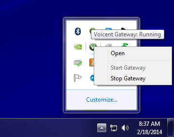 Open your Voicent Gateway. It is located in the bottom right of your windows task bar. The image below shows the default location of your Voicent Gateway.