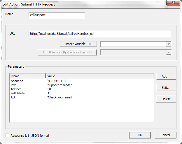 The call is initiated by sending an HTTP request to the gateway. The usage of callreqHandler.jsp is defined online under the developer section: http://voicent.com/devnet/docs/callreqref.htm