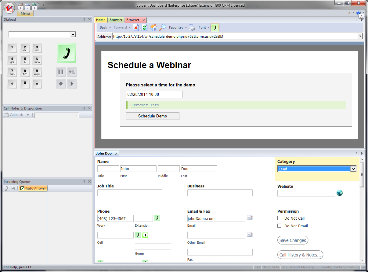 After the customer sends the request for a webinar the system will automatically alert a presenter to schedule a webinar through email. This email will include a link to schedule the demo in addition to the customer's CRM information. If the presenter doesn't schedule an appointment within an allotted amount of time the system will automatically alert the presenter through text and/or a call. The presenter can then schedule a webinar. Scheduling the webinar through Voicent's Dashboard internet browswer (as opposed to your regular browser) will allow the system to include the customer's CRM information: