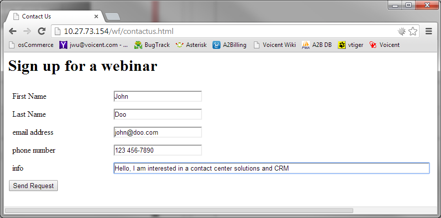 From a customer's viewpoint, this workflow is very simple. The customer signs up online for a webinar or demonstration by filling out a simple form that includes the customer's name, email address, phone number, and an "info" text field.