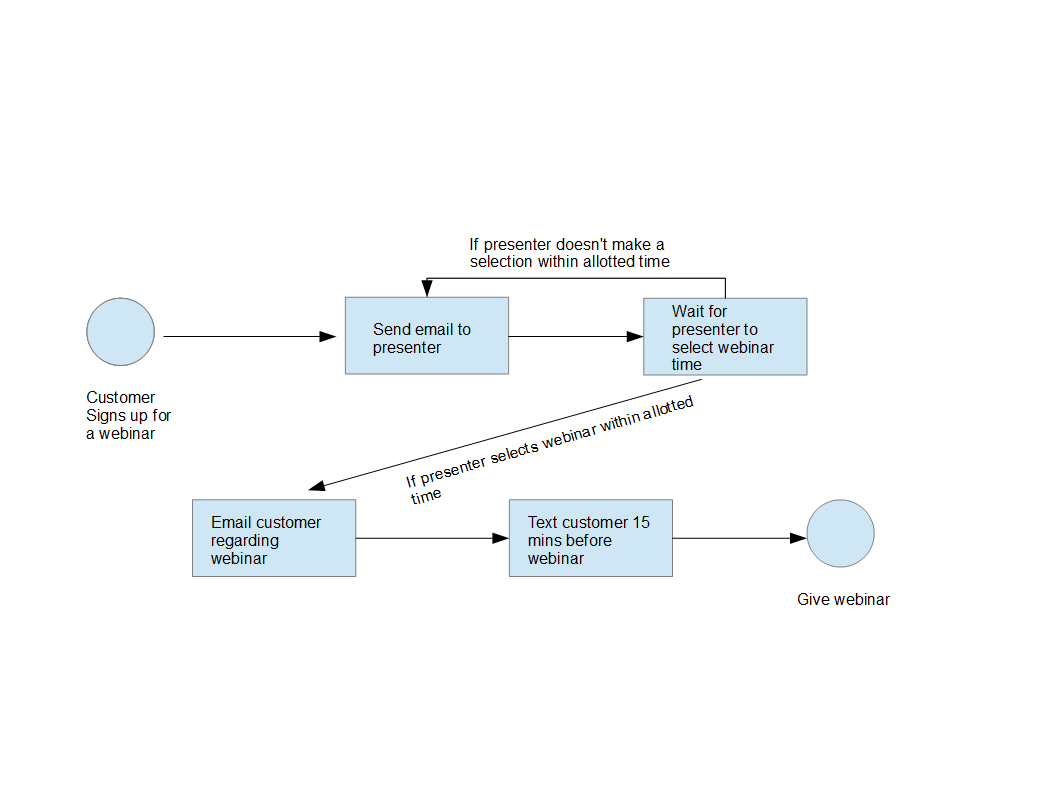 In this example, we're going to create a workflow system for a customer signing up for a webinar and the presenter scheduling a webinar for the customer. When the customer signs up for a webinar, the presenter is notified and is allotted some time to schedule the webinar. If the presenter doesn't schedule a webinar within the allotted time, we will give the presenter a call and send a reminder email. If he still doesn't schedule a webinar, then we're going to schedule the webinar to the earliest upcoming webinar.