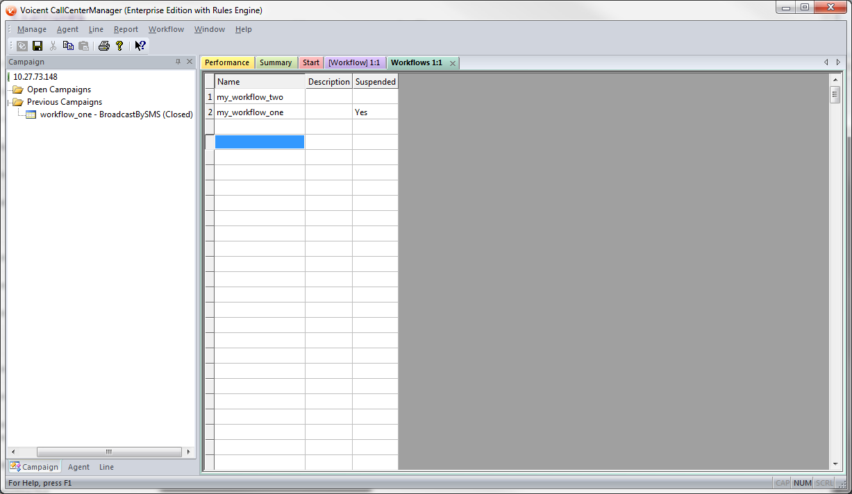 Each of these workflow instances will have separates states and variables. We can use Voicent CallCenterManager to look at the definitions of deployed workflows, states and variables of all instances of all the workflows that you have deployed. You can do this by going to the "Workflow" menu in Voicent CallCenterManager:
